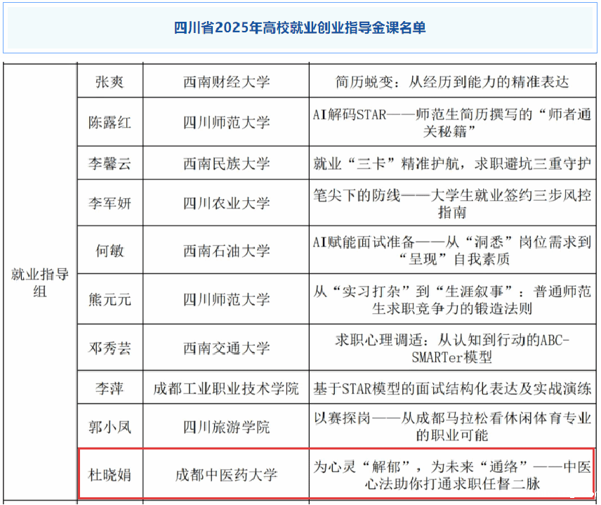 近日,四川省2025年高校就业创业指导金课建设活动评选结果揭晓,我校临床医学院杜晓娟老师课程《为心灵“解郁”,为未来“通络”——中医心法助你打通求职任督二脉》脱颖而出,评为省级金课。
